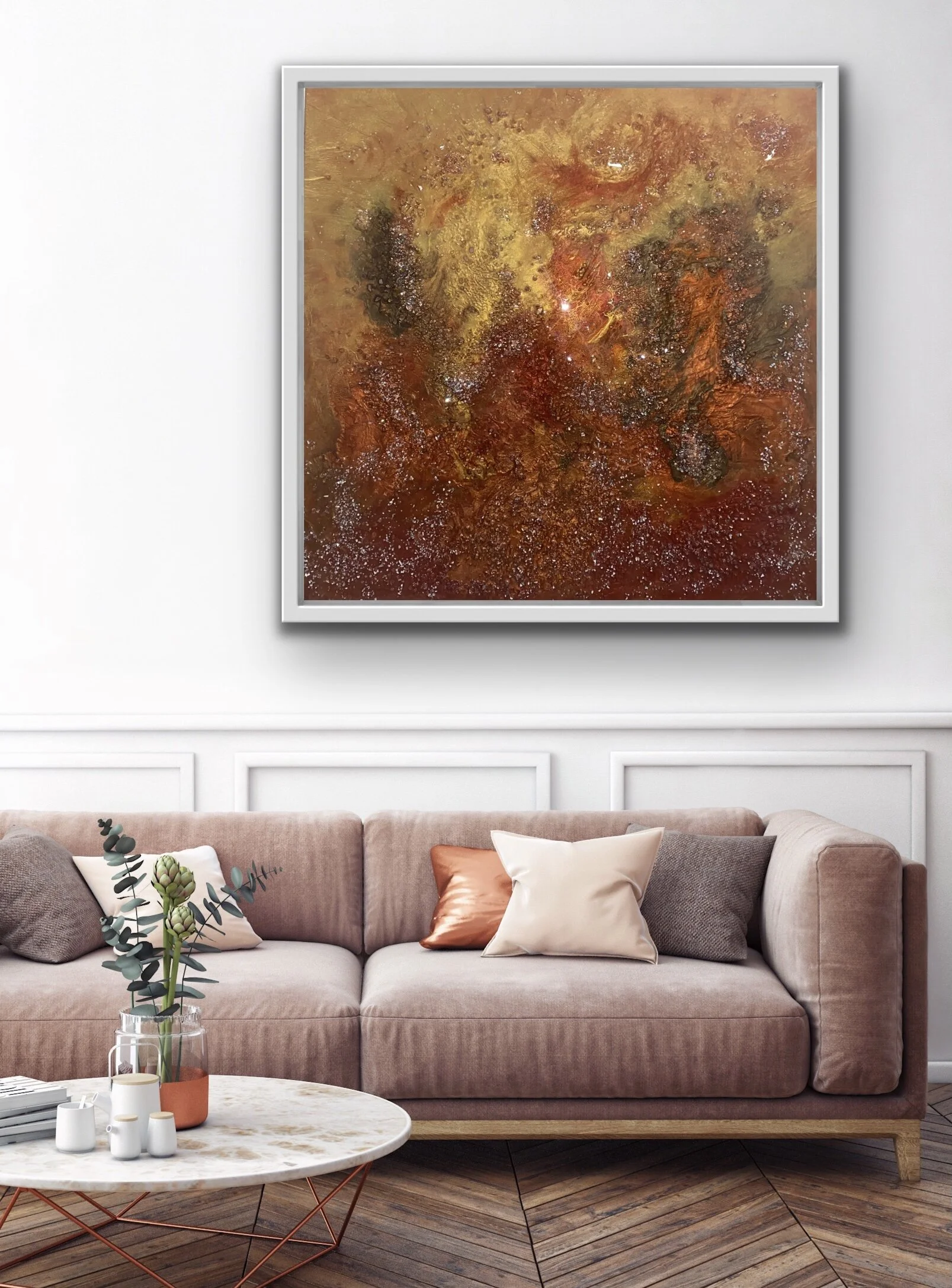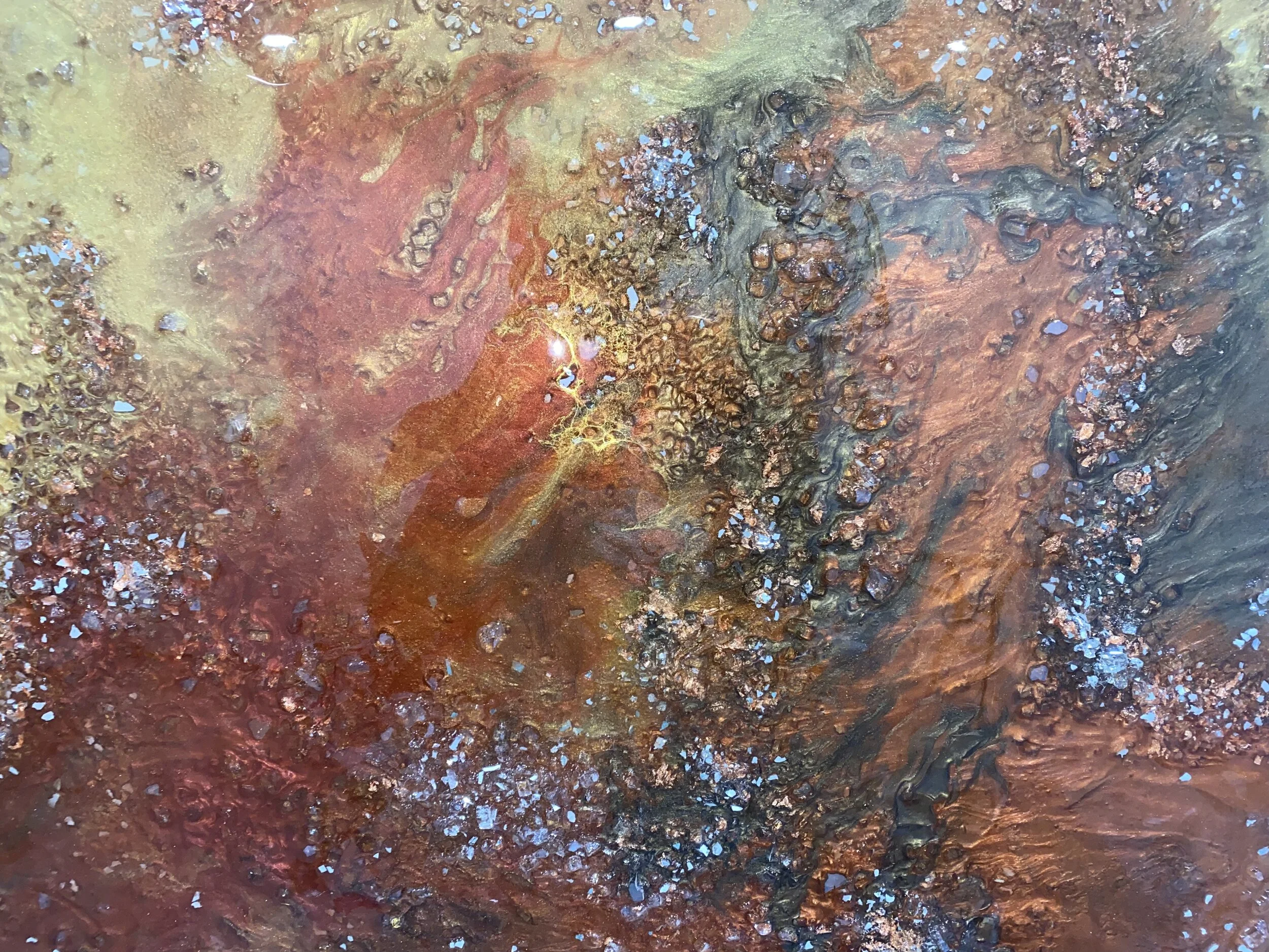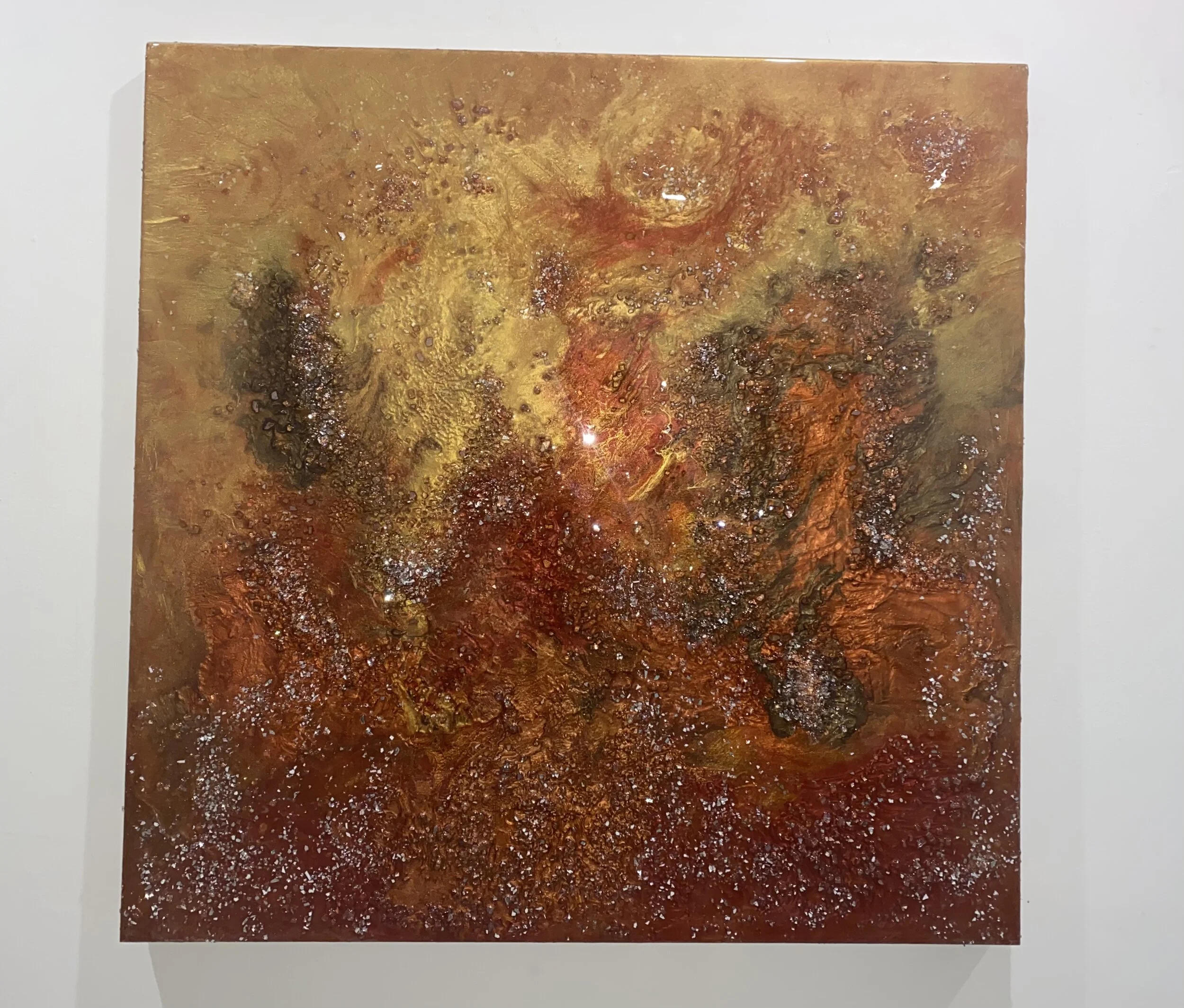 Details: 36” x 36” inches abstract painting on wood panel. Made with resin, acrylic paint, mica, crushed glass, clear quartz crystals