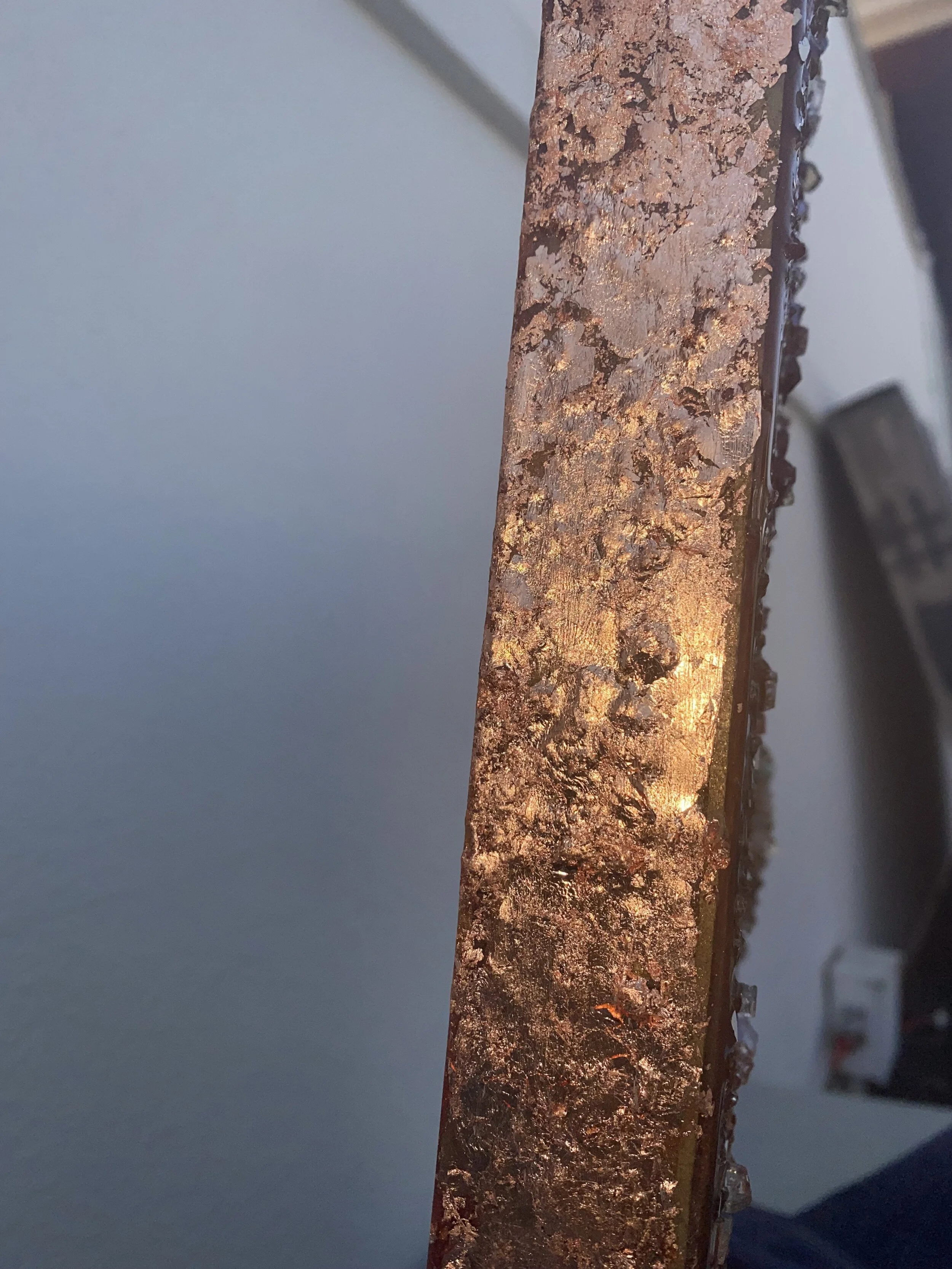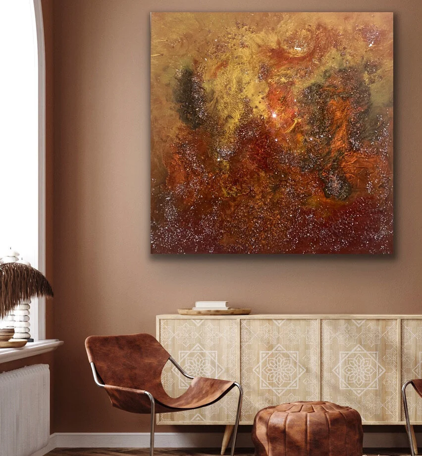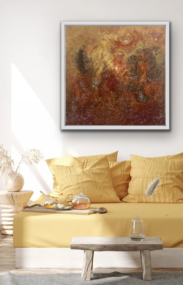 Details: 36” x 36” inches abstract painting on wood panel. Made with resin, acrylic paint, mica, crushed glass, clear quartz crystals